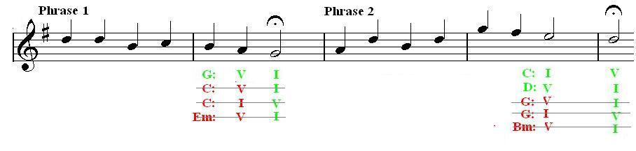 - I to V in C - although this fits, the previous note is an F#, which is not in C major - therefore less likely