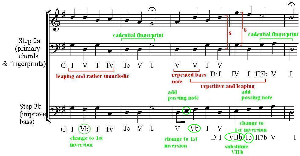 Only change the harmonies if it is necessary in order to create a good bass line - if you change them too much you will destroy the clear sense of key achieved in step 2b. Less is often more ... |